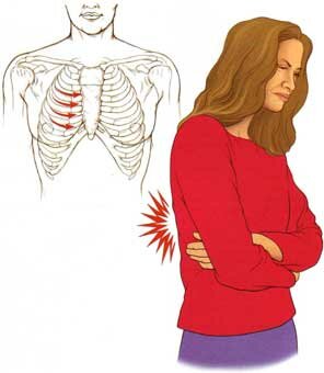 Главный симптом межреберной невралгии — нестерпимая изматывающая боль в грудной клетке. Она может быть опоясывающей или ощущаться только в одной стороне грудной клетки, поражать одно, реже два и три межреберья. Чаще всего боль локализуется в области V — IX ребер слева и ниже пупка, она может иррадиировать в шею, лопатку, руку или поясницу. Иногда боли носят тупой, ноющий характер, сопровождаются неприятными ощущениями, они могут быть постоянными или приступообразными. Во время приступа в межреберных промежутках ощущается острая, жгучая, стреляющая или режущая боль. Приступы иногда сопровождаются подергиванием мышц, потоотделением, кожа на пораженном участке краснеет или бледнеет. Интенсивность боли зависит от положения тела, как правило, она усиливается при движении грудной клетки — глубоком вдохе, кашле, чихании, зевании, громком разговоре, смехе. Резкая боль возникает при пальпации (прощупывании) определенных участков тела, например, областей между ребрами, вдоль позвоночника или грудной клетки. Больному больно дышать, проблематично повернуться в постели, у него кружится голова. Нередко боль сопровождается нарушением чувствительности, онемением кожи («ползанием , мурашек» по коже) над пораженным нервом, жжением.