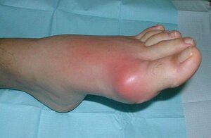 Начало заболевания чаще начинается среди полного здоровья, внезапно, нередко среди ночи. Появляются резчайшие боли в большом пальце стопы. Сустав припухает, кожа над ним краснеет, затем становится синевато — багровой, горячей, температура тела повышается до 38 — 390, кожа над суставом блестит, напряжена, функция сустава нарушена, больной обездвижен.